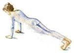 Először a térdünket, majd mellkasunkat, végül homlokunkat tegyük le a talajra. Figyeljünk arra, hogy csípőnk továbbra is a levegőben legyen, finom hátra hajlítást adva így a gerinc alsó szakaszának. A levegőt még mindig bent tartjuk!