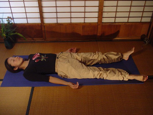 Hátunkon fekszünk, lábaink lazán szétnyílnak, lábfejek kifelé fordulnak. Kezeink a testünk mellett tenyérrel felfelé lazán pihennek. Egész testünk legyen szimmetrikus, hátunk minél jobban simuljon a talajra. Szemünket csukjuk be, és kezdjük megfigyelni a légzésünket. Próbáljunk 3 ütemre belélegezni, 3 ütemre kilélegezni. Majd figyeljük meg a testünket a lábujjainktól felfelé egészen a fejünk búbjáig, és egy kis koncentráltsággal feszítsük meg belégzésnél majd lazítsuk el kilégzésnél főbb izmainkat. Gondolatban, vagy akár hangosan nevezzük meg testrészeinket, és mondjuk ki: “tökéletesen ellazult”.
