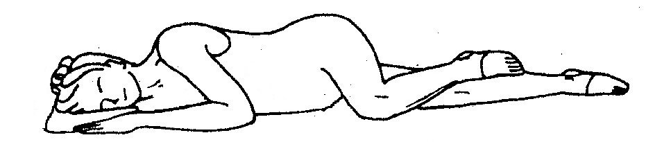 Oldalunkra fekszünk, a fent lévő lábunkat térdben behajlítjuk felhúzzuk, a térdünkön támaszkodunk. Karjainkat behajlítjuk és szintén